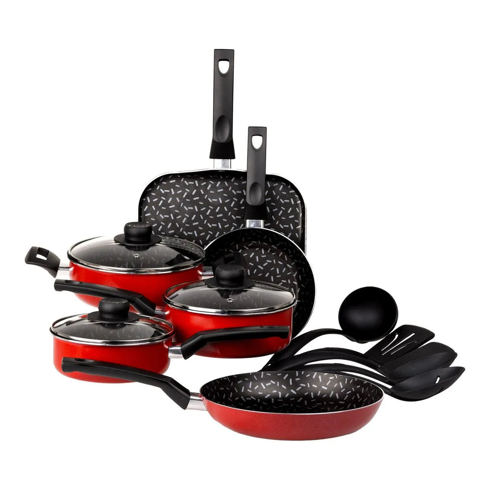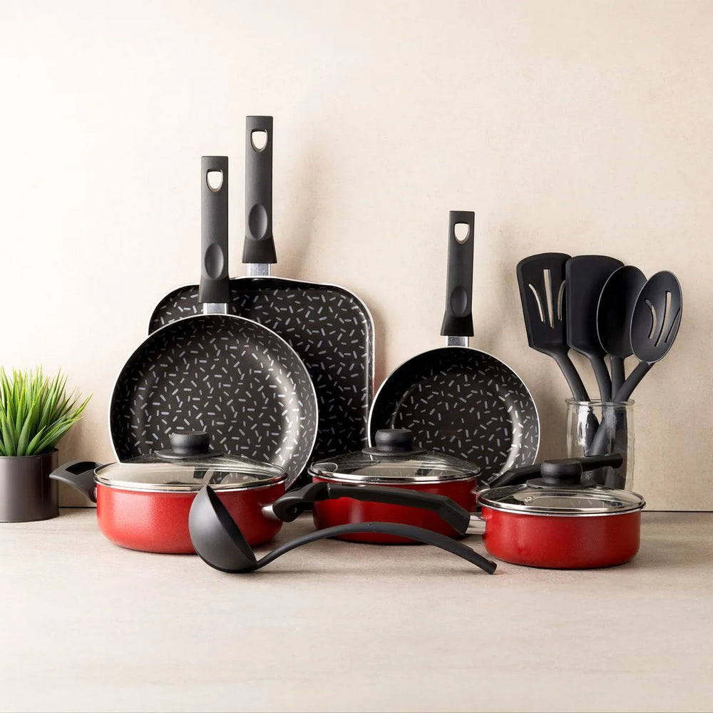 La batería EKCO/Vasconia 70010201 incluye 14 piezas esenciales para tu cocina, con grosor de 1.5 a 1.7 mm que garantiza durabilidad y distribución uniforme del calor . Su acabado en color rojo aporta estilo a tu cocina y cada pieza cuenta con mangos resistentes al calor , aptos para un uso seguro y cómodo. Perfecta para hervir, freír, cocer y preparar cualquier receta con confianza y eficiencia.