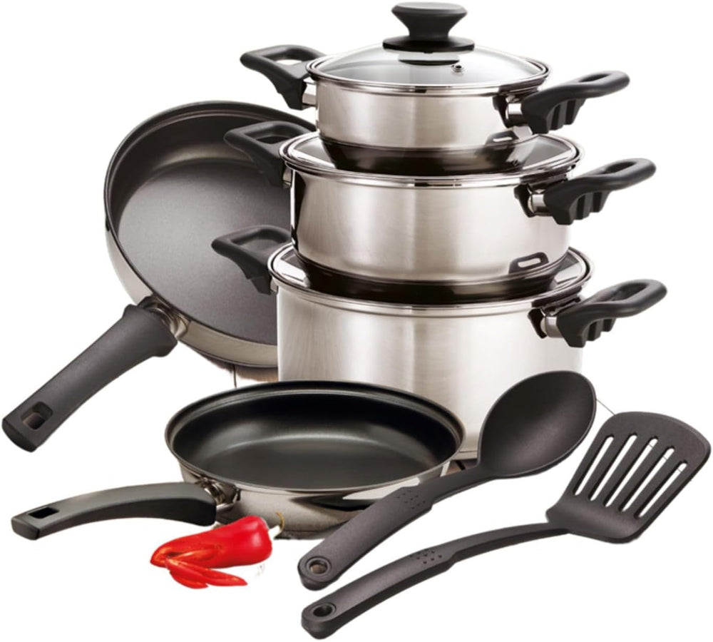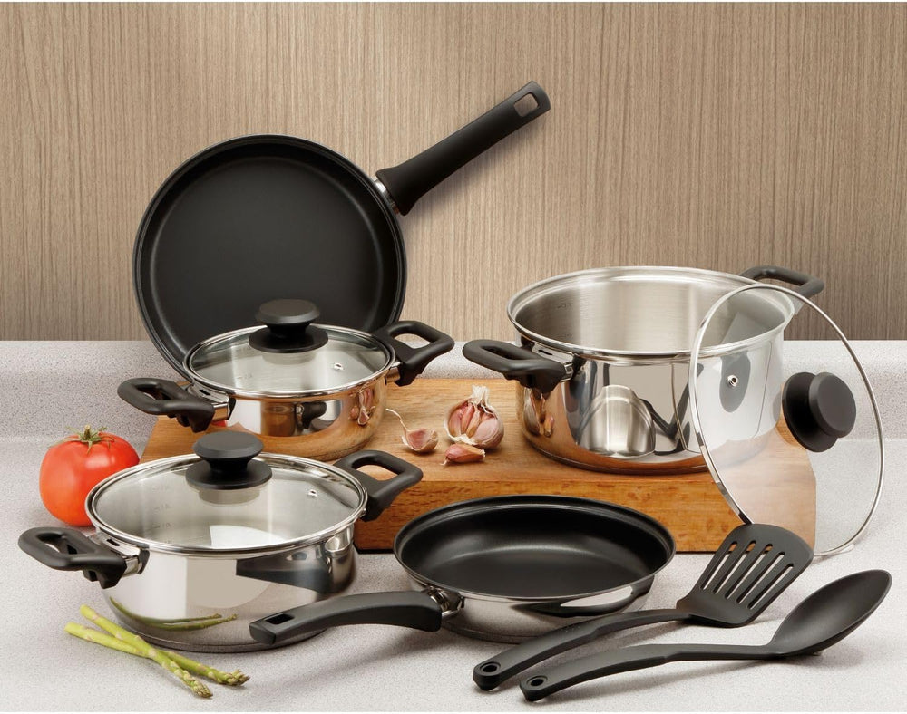 La batería Tramontina de 10 piezas está fabricada en acero inoxidable de 0.5 mm , ofreciendo ligereza y resistencia para un uso diario eficiente. Su diseño clásico en acero inoxidable permite una cocción uniforme y es fácil de limpiar , mientras que los mangos ergonómicos proporcionan seguridad y comodidad al cocinar. Esta batería es versátil y práctica, perfecta para quienes buscan calidad y funcionalidad en la cocina.