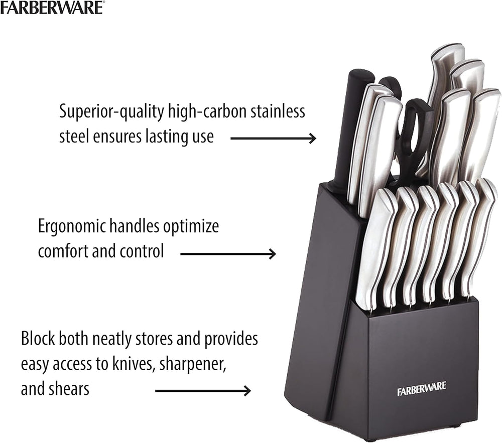 El set de cuchillos Farberware 60000056 incluye 15 piezas fabricadas en acero inoxidable de alta calidad , resistentes a la corrosión y al desgaste. Cada cuchillo está diseñado para ofrecer cortes precisos y seguros , siendo perfecto para tareas de cocina diaria, desde picar verduras hasta cortar carnes. Sus mangos ergonómicos proporcionan comodidad y control durante el uso, mientras que el diseño elegante combina funcionalidad y estilo en tu cocina. Ideal para chefs aficionados y profesionales.