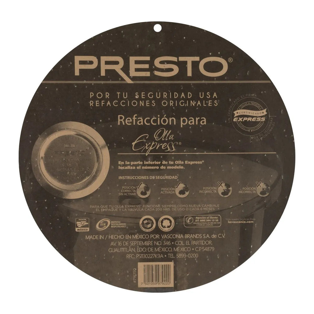 El Empaque Presto 79222 está compuesto por un anillo de goma altamente flexible y una válvula de liberación de presión, ambos esenciales para el funcionamiento seguro y eficiente de tu olla express Presto Premier. El empaque está fabricado con hule duradero que asegura un sellado hermético contra la tapa, lo que permite mantener la presión interna adecuada durante la cocción. La válvula de seguridad controla y libera el exceso de presión cuando es necesario, evitando posibles accidentes o desperfectos durante la operación. Este kit es compatible con las ollas a presión Presto Premier troqueladas de 5, 6, 7 y 8 litros , lo que lo hace muy versátil para distintos tamaños de olla. Se recomienda reemplazar estas piezas aproximadamente cada 200 horas de uso o cada 6 meses , garantizando el funcionamiento óptimo y seguro del equipo. Además, su instalación es sencilla y no requiere herramientas especializadas, lo que permite mantener la olla en condiciones ideales de manera rápida y efectiva. Esta refacción ayuda a prolongar la vida útil del equipo y a mantener sus sistemas de seguridad en perfecto estado.
