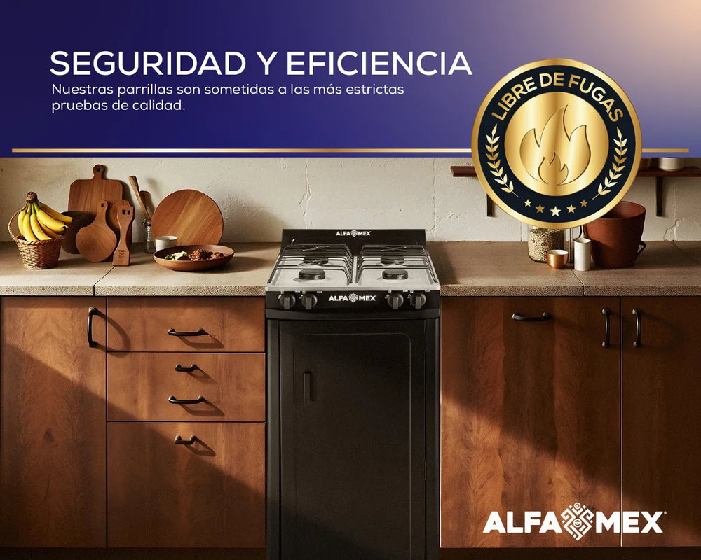La Estufa Alfa Mex 211 Gabinete Negro es una parrilla de gas LP que combina funcionalidad y diseño en un solo producto. Cuenta con cuatro quemadores de alta eficiencia que permiten una cocción rápida y homogénea de tus alimentos, ideal para preparar desde guisos hasta parrilladas. Su estructura está fabricada en acero porcelanizado negro, lo que le proporciona resistencia al desgaste y una fácil limpieza.El gabinete inferior integrado ofrece un amplio espacio para almacenar utensilios de cocina, sartenes o incluso el tanque de gas, manteniendo tu área de trabajo organizada y libre de desorden. Este diseño también facilita el acceso al tanque de gas, permitiendo una conexión segura y sencilla.El modelo Alfa Mex 211 está diseñado para operar con gas LP, asegurando un rendimiento eficiente y económico. Su encendido es manual, lo que lo hace fácil de usar sin necesidad de electricidad. Además, su acabado en color negro le otorga un aspecto moderno y elegante, que se adapta a diversos estilos de cocina.A un precio accesible, esta estufa es una opción ideal para quienes buscan calidad y funcionalidad sin comprometer su presupuesto. Es perfecta para hogares, cocinas de campo o espacios donde se requiere un equipo duradero y eficiente.