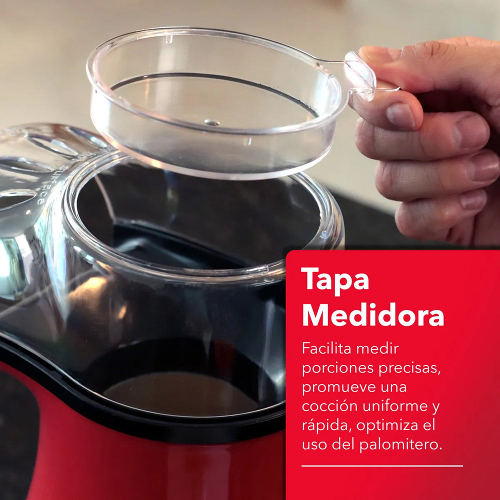 Potencia: 40 W (aire caliente), sin necesidad de aceite para preparar palomitas más saludables. Capacidad: tapa medidora para 70 g de maíz, ideal para una tanda por uso. Diseño compacto y seguro: cuenta con base de cuatro patas para estabilidad. Resistente al calor y fácil de almacenar. Operación sencilla: botón lateral para encendido y apagado; comienza a funcionar en cuanto enciendes. Sin aceite y bajo mantenimiento: películas de aire, sin restos de grasa, y limpieza rápida.