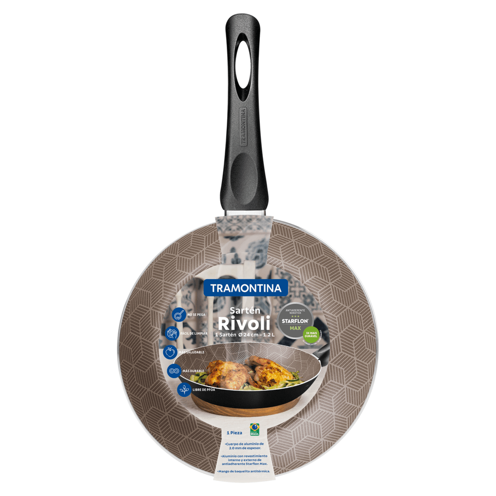 Fabricada en aluminio de 2 milímetros de espesor y con un revestimiento interno y externo con antiadherente Starflon Max, garantiza una cocción rápida y uniforme de los alimentos, evita que se peguen en la superficie y, gracias a ello, también es mucho más fácil de limpiar. Su mango de baquelita antitérmica no se calienta y permite un manejo más seguro y mucho más cómodo. ¡Además, es apta para lavavajillas, por lo que facilitará la preparación y terminación de sus recetas! Recomendaciones de uso La capacidad volumétrica máxima de cocción es de 3/4 de la capacidad total de la pieza. Ponga el mango del utensilio hacia el centro de la cocina. En cocinas con rejilla, centralice la pieza sobre la llama o fuente de calor y alinee el mango a la rejilla. Los utensilios calientes deben estar fuera del alcance de los niños. Antes del primer uso, lave con esponja suave, jabón neutro o detergente líquido. Después de secar, unte el área interna con aceite o grasa y lleve al fuego por uno o dos minutos. Deje enfriar y lave nuevamente. Su utensilio Starflon está listo para el uso con o sin grasa, siempre a fuego bajo o mediano (nunca superior a 260 °C). Para mover los alimentos use solamente utensilios de silicona, nylon o madera. Con el uso el mango puede aflojarse debido a la dilatación normal de los materiales. Vuelva a apretarlos solamente lo suficiente, sin forzar. Limpieza: Evite la inmersión del utensilio caliente en agua fría. Nunca utilice productos abrasivos durante el lavado. Si deja quemar alimentos, humedezca el área y reserve hasta que pueda eliminar los residuos pegados con esponja y jabón. Para el descarte de los productos y del embalaje, siga las orientaciones de reciclado vigentes. Informaciones GeneralesCuerpo de aluminio con espesor de 2 mm, que brinda una cocción rápida y uniforme. Revestimiento interno y externo de antiadherente Starflon Max, que no deja que se peguen los alimentos y es fácil de limpiar, más durable y no perjudicial para la salud, ya que está libre de PFOA. Mango de baquelita antitérmica que ofrece seguridad durante el manejo. Se pueden llevar al lavavajillas facilitando tu día a día. Especificaciones TécnicasAltura7,4 cm Ancho24,4 cm Longitud42,6 cm Peso450 Gramos