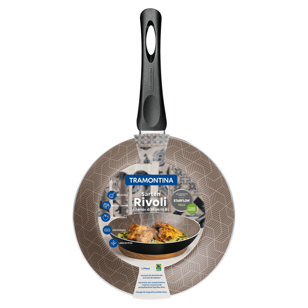 stá fabricada en aluminio de 2 milímetros de espesor y con revestimiento interno y externo con antiadherente Starflon Max, estas dos características brindan una cocción rápida y uniforme de los alimentos, evitan que se peguen en la superficie y hacen que sea más fácil de limpiar. Su mango de baquelita antitérmica no se calienta y garantiza más seguridad durante el uso. Es una sartén fácil de manejar y limpiar, ya que es apta para lavavajillas, lo que facilitará su rutina. ¡Elija Tramontina y complete su cocina con productos de calidad! Especificaciones TécnicasAltura7,6 cm Ancho26,3 cm Longitud44,5 cm Peso520 Gramos
