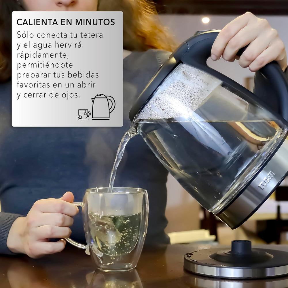 La RCA RC-328 es una tetera eléctrica moderna y funcional, ideal para preparar té, café instantáneo o cualquier infusión de manera rápida y sencilla. Gracias a su potencia de 1000W , el agua alcanza la temperatura de ebullición en pocos minutos, optimizando tiempo y energía.Su jarra de cristal transparente resistente al calor permite visualizar el proceso de ebullición, aportando un diseño elegante y práctico a la cocina. Con una capacidad de 1.8 litros , es perfecta para familias o reuniones, evitando recargas constantes.Cuenta con un sistema de apagado automático al alcanzar la temperatura adecuada, garantizando seguridad en su uso. Además, incluye base giratoria de 360° , lo que facilita colocar y retirar la tetera en cualquier posición, junto con un mango ergonómico frío al tacto que brinda mayor comodidad.Compacta, ligera y fácil de limpiar, la Tetera Eléctrica RCA RC-328 es una excelente opción para quienes buscan practicidad y estilo en su día a día.