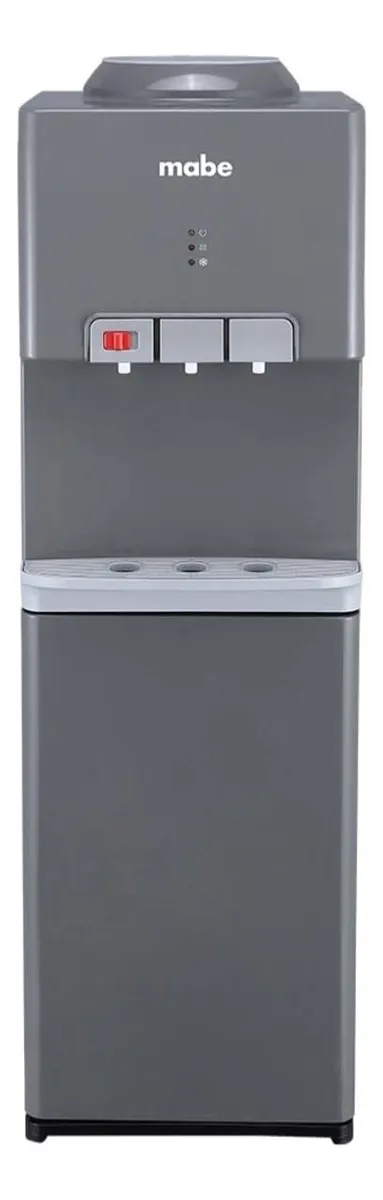 Un despachador de agua práctico y moderno: el Mabe EMTL3CGG es un modelo de piso en acabado gris que ofrece tres llaves independientes para agua fría, templada y caliente. Incluye luces indicadoras, un gabinete inferior para almacenamiento y se activa fácilmente mediante interruptores de enfriamiento y calentamiento.