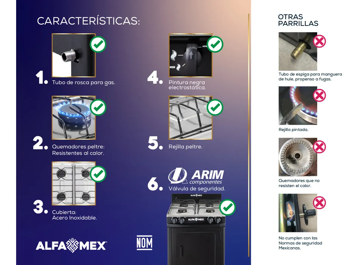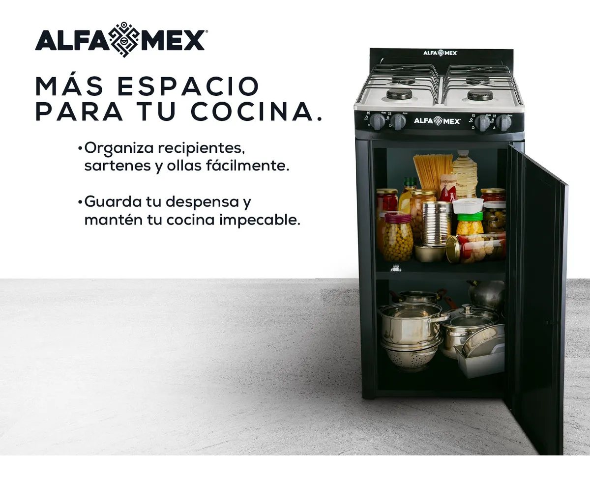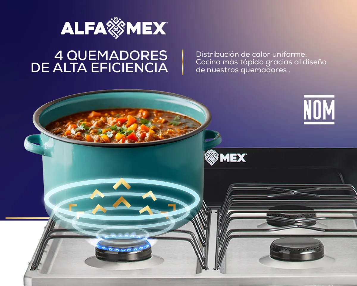 El modelo Alfa Mex 211 está diseñado para operar con gas LP, asegurando un rendimiento eficiente y económico. Su encendido es manual, lo que lo hace fácil de usar sin necesidad de electricidad. Además, su acabado en color negro le otorga un aspecto moderno y elegante, que se adapta a diversos estilos de cocina.