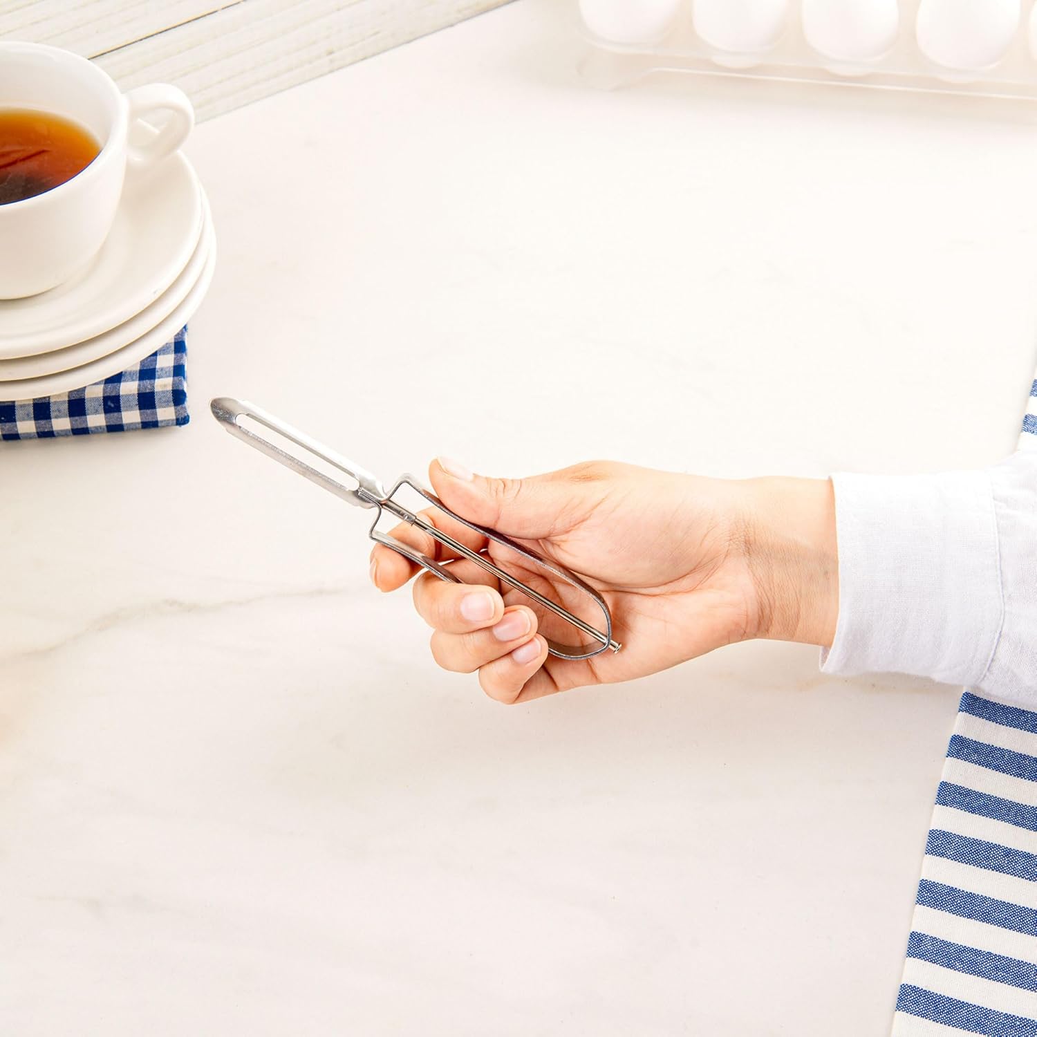 Pelador de verduras en acero inoxidable, con cuchilla giratoria que facilita el corte sin esfuerzo. Perfecto para uso diario, seguro y duradero.