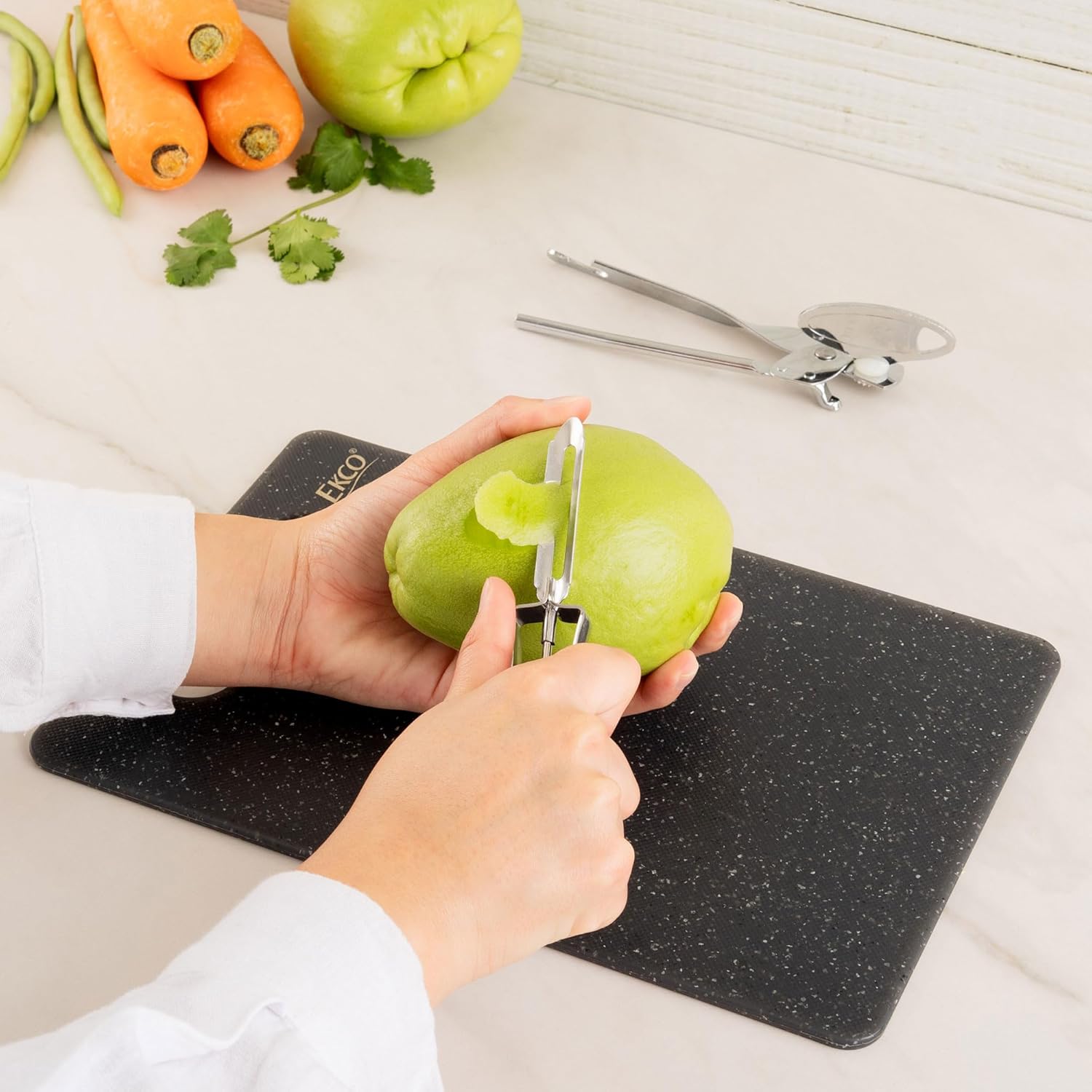 El Pelador Ekco 50313/60000625 es una herramienta de cocina robusta, construida completamente en acero inoxidable, lo que brinda mayor resistencia a la corrosión y limpieza sencilla. Su cuchilla giratoria flotante se adapta a la superficie de frutas y verduras para pelarlos de manera uniforme y sin desperdicio, haciendo el proceso más eficiente.